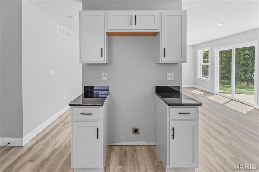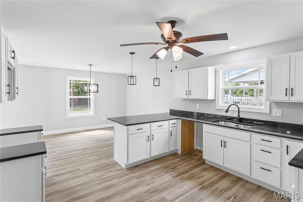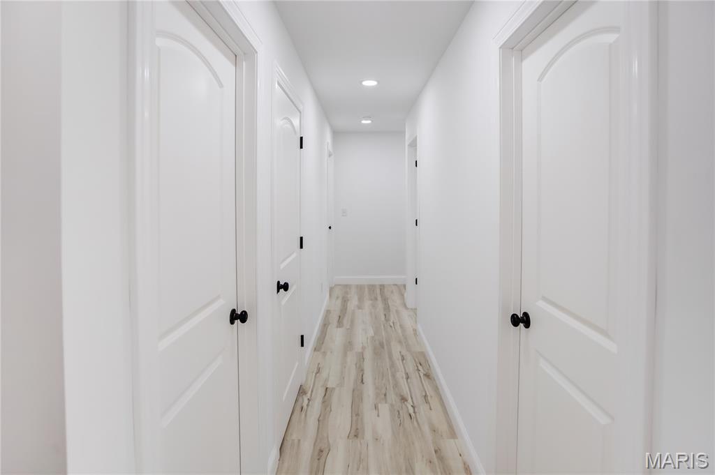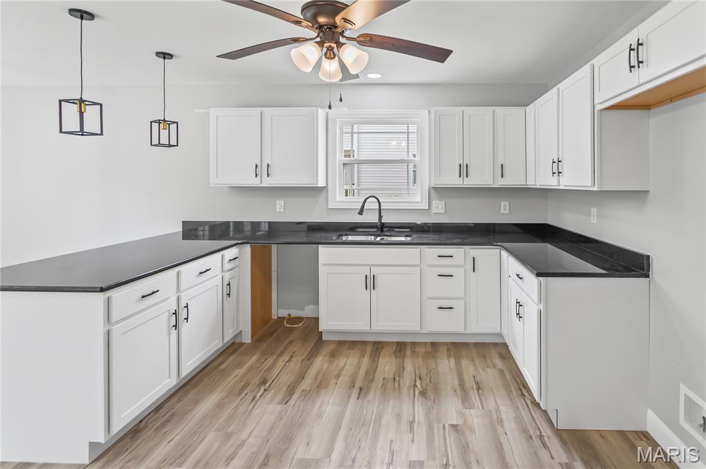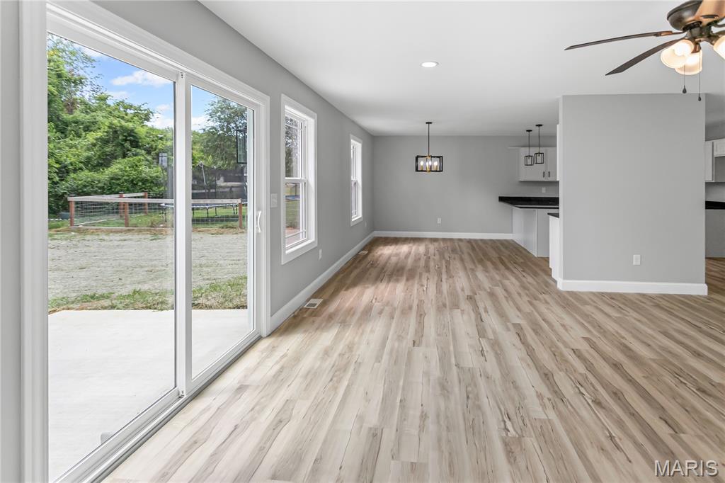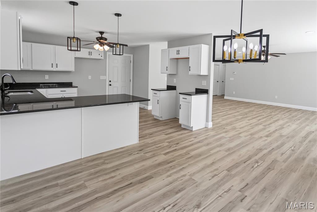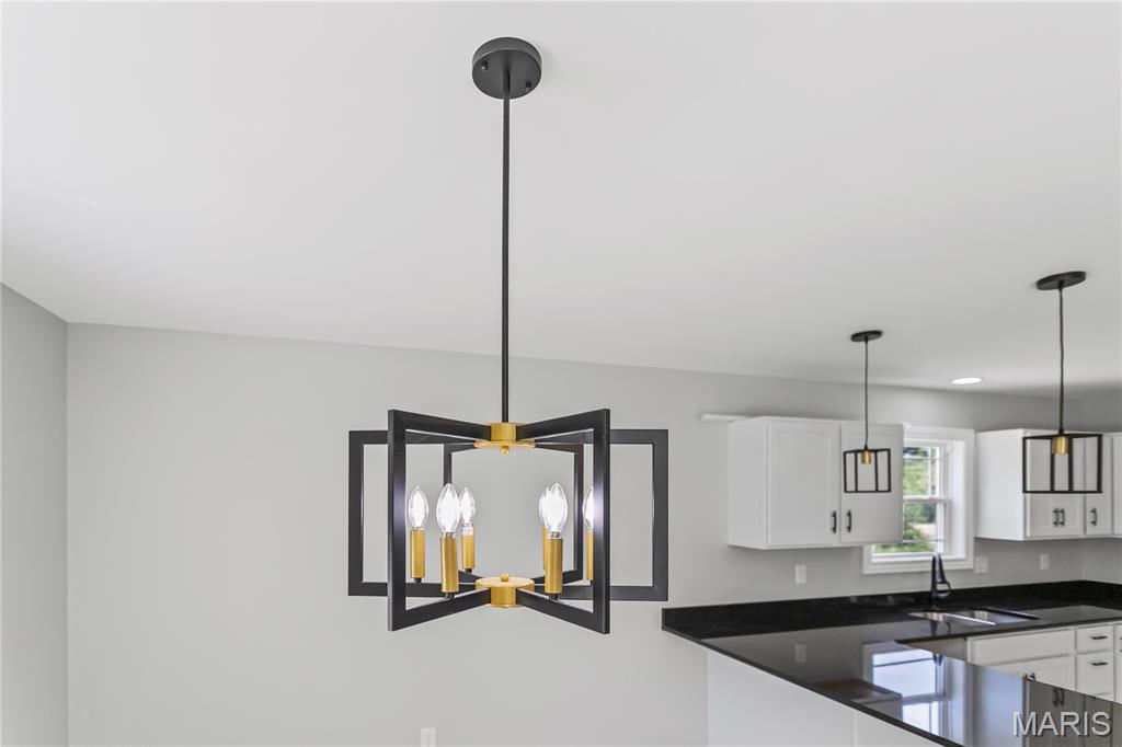Welcome Home to 1122 Redwing! This stunning newly built 3-bedroom, 2-bath ranch offers 1,645 square feet of modern living space designed with comfort and style in mind. Nestled on a lot with trees as a backdrop, this home balances neighborhood living with a sense of privacy. Step inside to find a spacious great room filled with natural light, highlighted by large windows and sliding glass doors that frame peaceful backyard views. The open-concept design flows seamlessly into the dining area and beautifully appointed kitchen, making it perfect for both everyday living and entertaining. The kitchen is a chef’s dream, featuring sleek white cabinetry, granite countertops, pendant lighting, and a large center island with seating. A modern black-and-gold lighting package and ceiling fans throughout add a touch of elegance and style. Retreat to the private primary suite, complete with plush carpet, a walk-in closet, and a spa-like bath boasting dual vanities and contemporary fixtures. Two additional bedrooms and a full guest bath provide plenty of space for family, guests, or a home office. Enjoy the convenience of a two-car garage, main-level laundry, and energy-efficient construction. Outside, the backyard offers a tranquil setting with endless opportunities for relaxation, play, or entertaining—whether you envision quiet mornings with coffee or lively gatherings with friends. This move-in-ready gem combines fresh, modern design with a welcoming neighborhood feel—ready for you to call home.